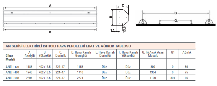 | ANEH-120-H Anemoessa Serisi Hava Perdesi Teknik Özellikler | |||||
