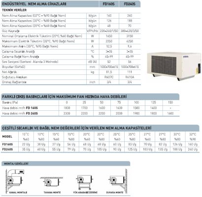 | FD-980S Endüstriyel-Kanallı Tip Nem Alma Cihazı Teknik Özellikler | |||||
