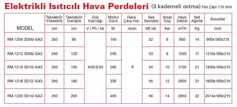 | RM-1220 ELEKTRİKLİ ISITICILI HAVA PERDESİ Teknik Özellikler | |||||